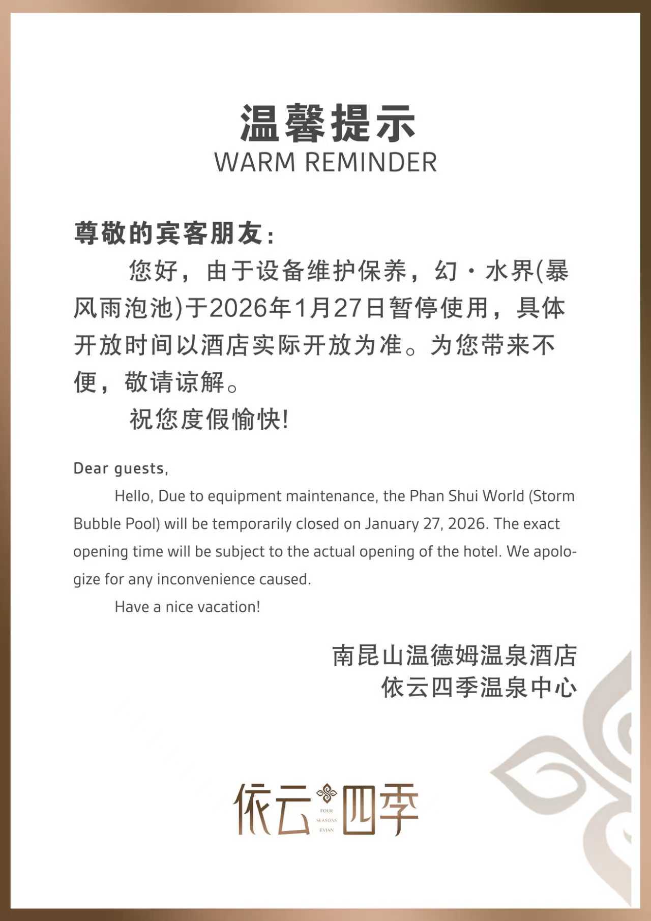 依云四季温泉中心部分游乐设施开放时间调整:(供参考,实际以到店为准)