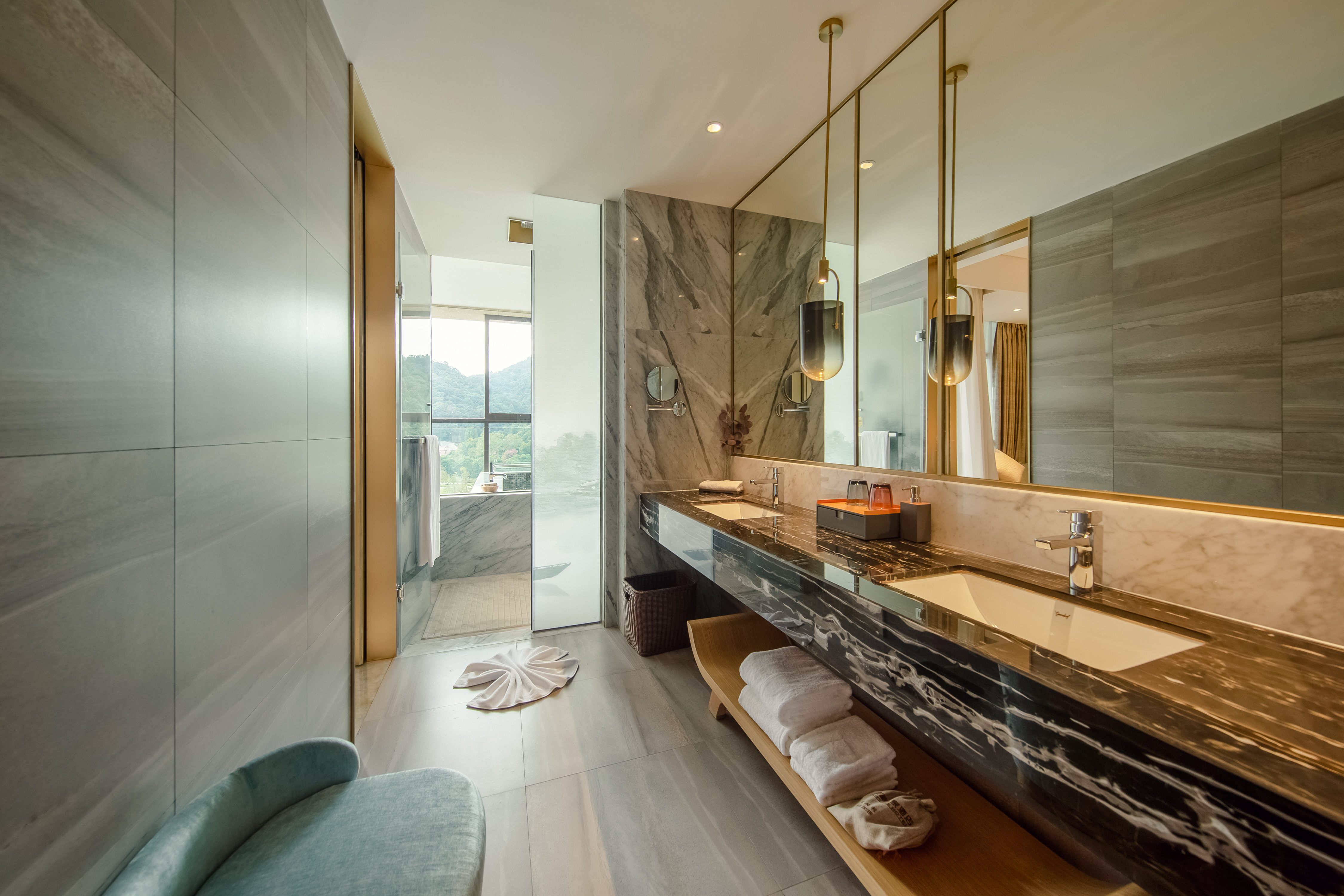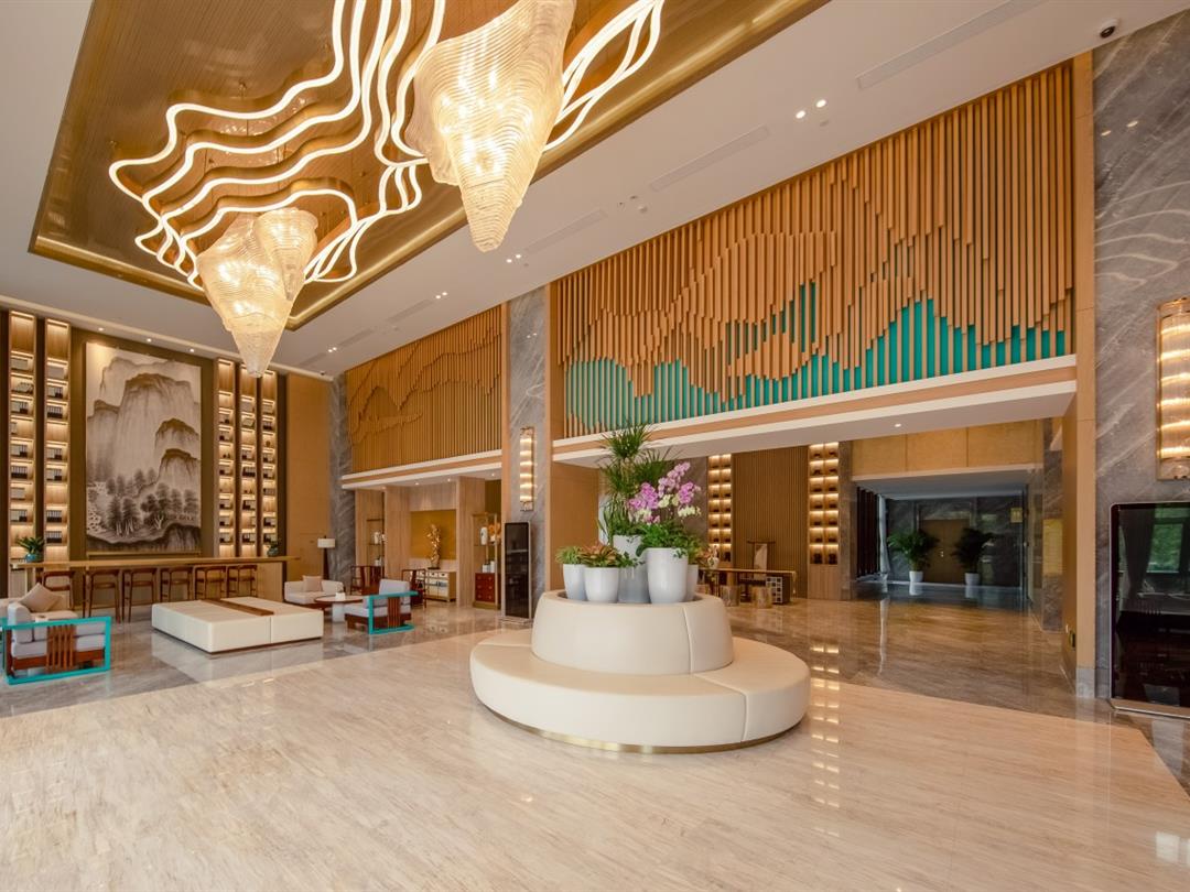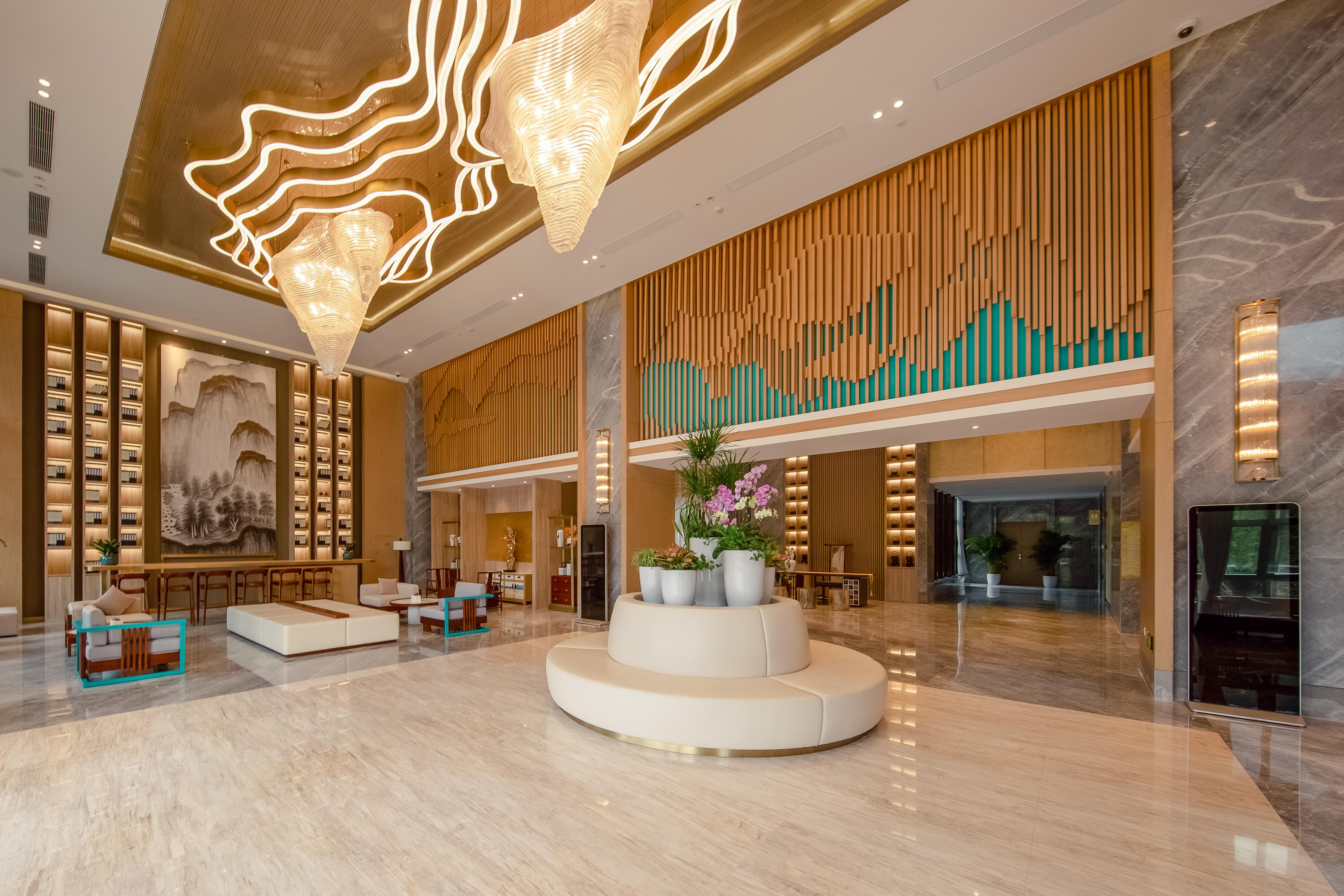 金绿色的高端色彩搭配和现代化的灯饰,把酒店装饰富丽堂皇。