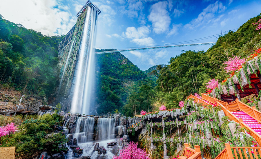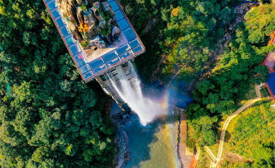 云门山云上飞瀑瀑布出水口宽8米,从顶端直流而下,一泻到底,其落差达168米,相当于五十层楼的高度,从远望去,百米瀑布倾泻而下,颇为壮观,瀑布内安装有3台观光电梯,每台观光电梯可同时容纳13人,是国内罕见的瀑布与电梯组合游玩项目,瀑布顶部设有80米长的观光平台供游客观景,站在观光平台上,可以直接俯瞰谷底的无限美景。