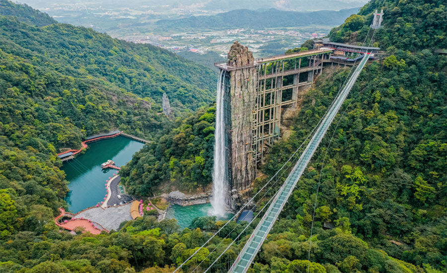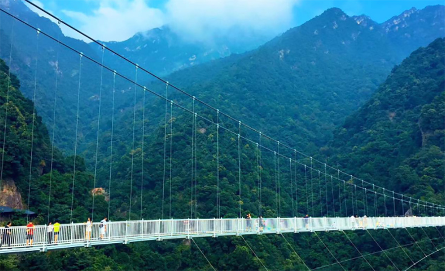 云门山玻璃桥全长316米,垂直高度达168米,桥体总宽为2.8米,是广东省内首座高空景观玻璃桥。玻璃桥两峰地势险峻,中间峡谷横穿,山间云雾缭绕,云深雾重之际,踏在玻璃桥上如若“脚踏祥云,腾云驾雾”。值风和日丽之时,踏在玻璃桥上,仿佛直接游走空中,行走在玻璃桥上犹如“人在空中走,景在脚下游”,惊险无比。