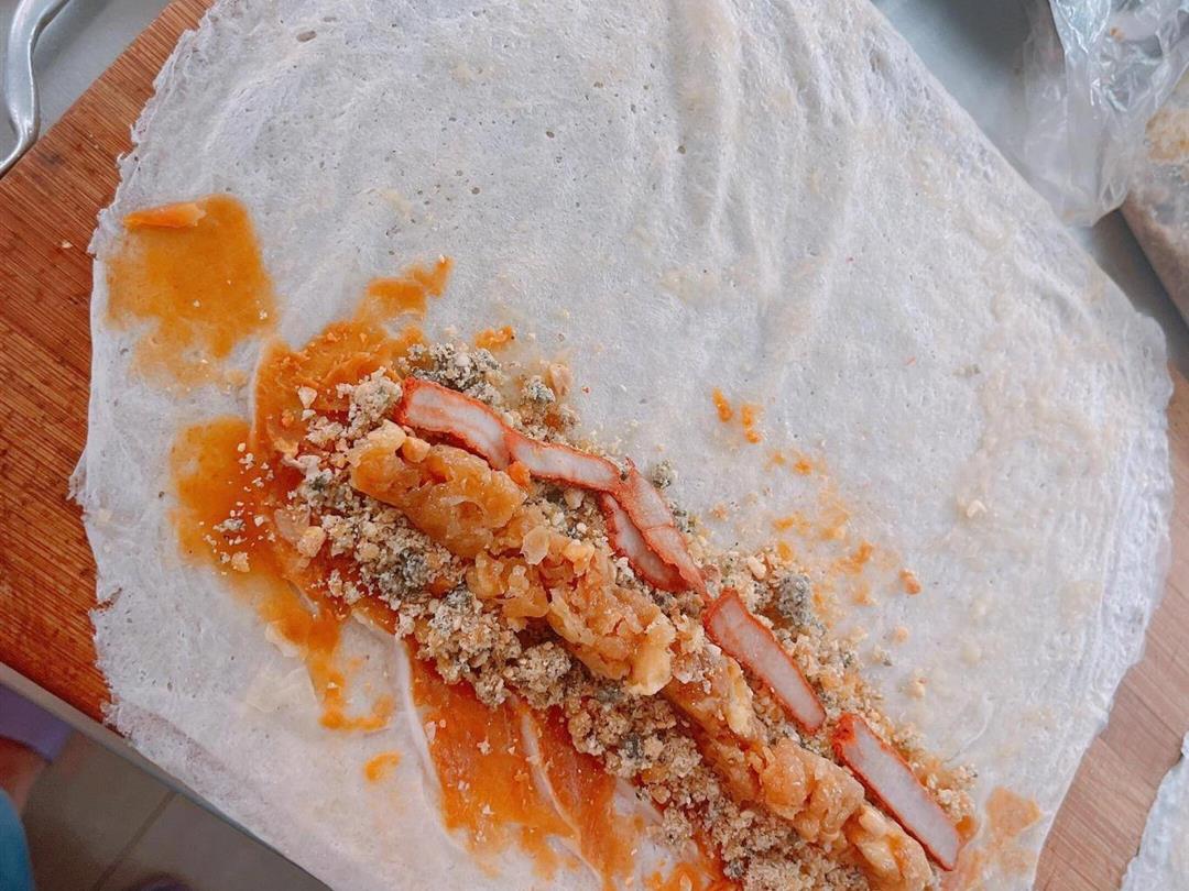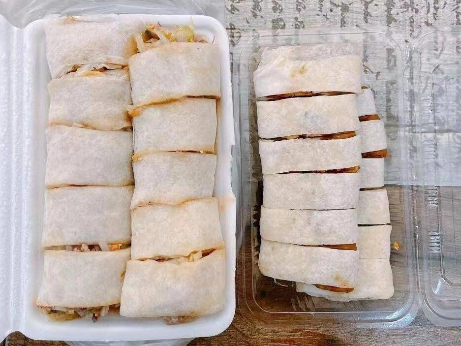 咸薄饼包着馅料是现炒的包菜鱿鱼干瘦肉之类的