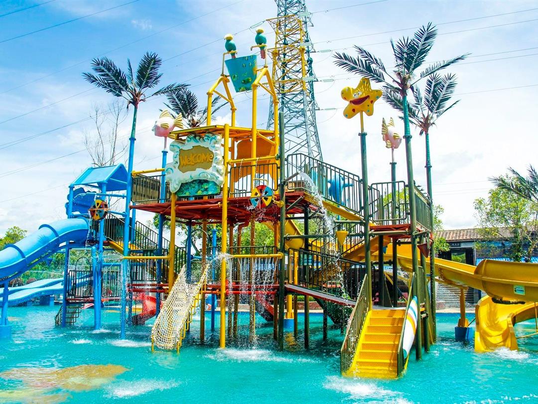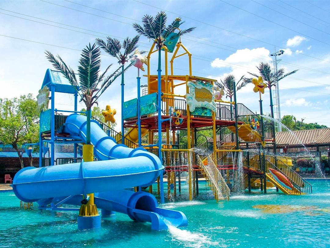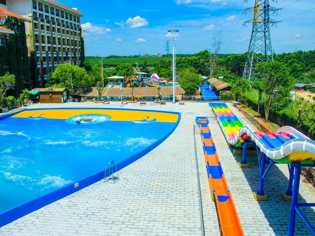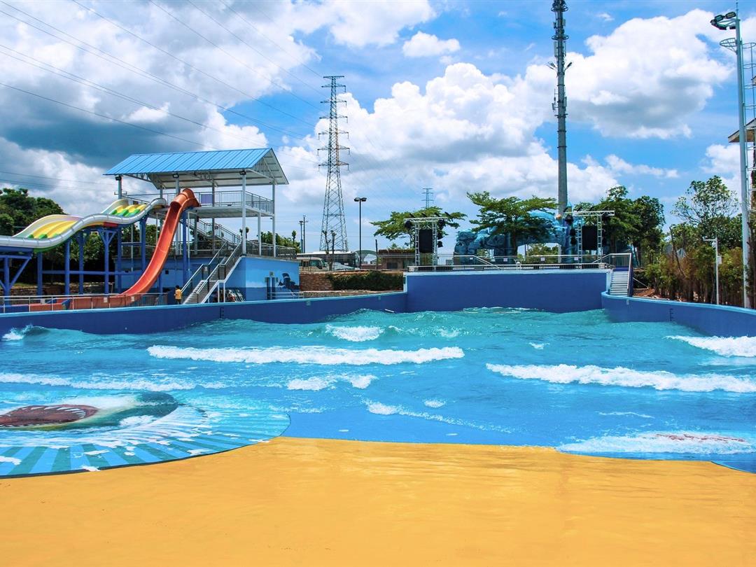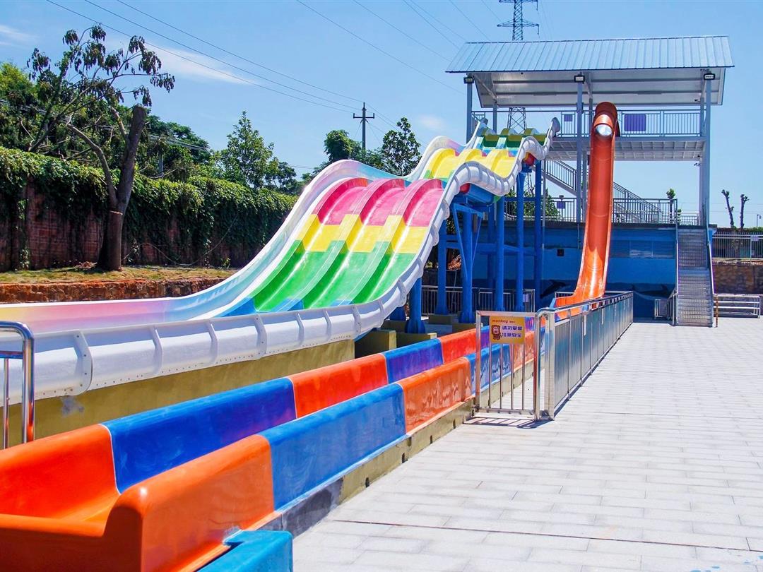 樟树湾水上乐园项目总占地面积11040㎡,外围有高大的海浪造型大门和宽广的前广场,内场设有8米高速滑梯、彩虹滑梯、家庭戏水滑梯、小喇叭滑梯、小冲天滑梯、章鱼滑梯等各类大小滑梯,还有仿真沙滩造浪池、哈皮大舞台、休息区等娱乐设备。