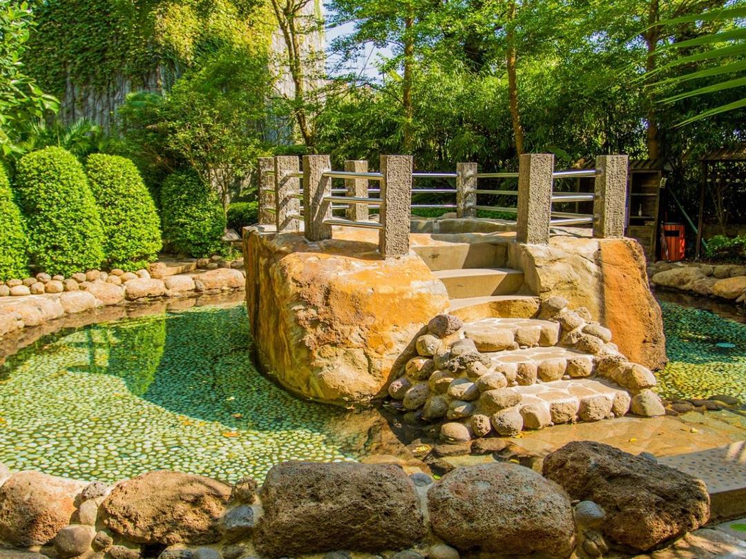 樟树湾温泉露天温泉区含1个大人游池、1个儿童游池、50个大小不一的温泉池、2个汗蒸房、1个热石板区、全园林式露天泳池、天然火山温泉等特色温泉。绚丽迷人的热带植物,青麻石、鹅卵石点缀,乔木、灌木高低错落,层次分明,每位客户可充分体验东南亚风情度假生活。早年雷州农村用作洗蕃薯的石缸,由原重75吨整石的雷州火山石雕凿而成,是温泉区当之无愧的“十八金缸”。