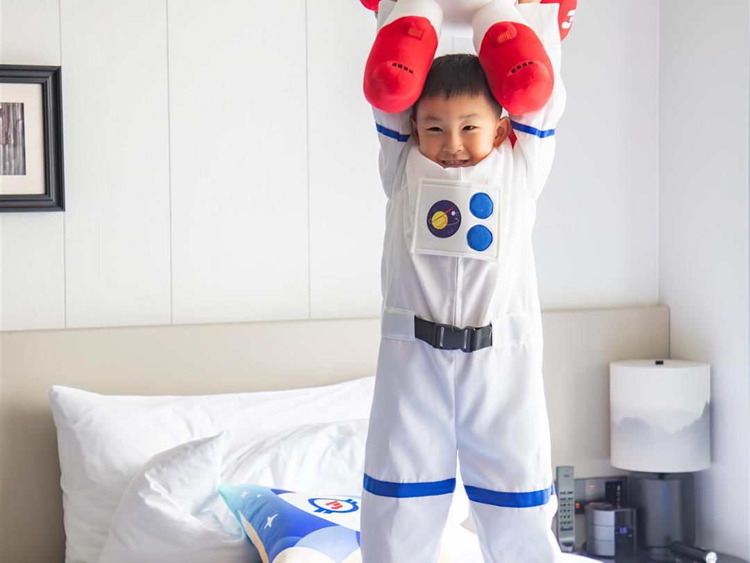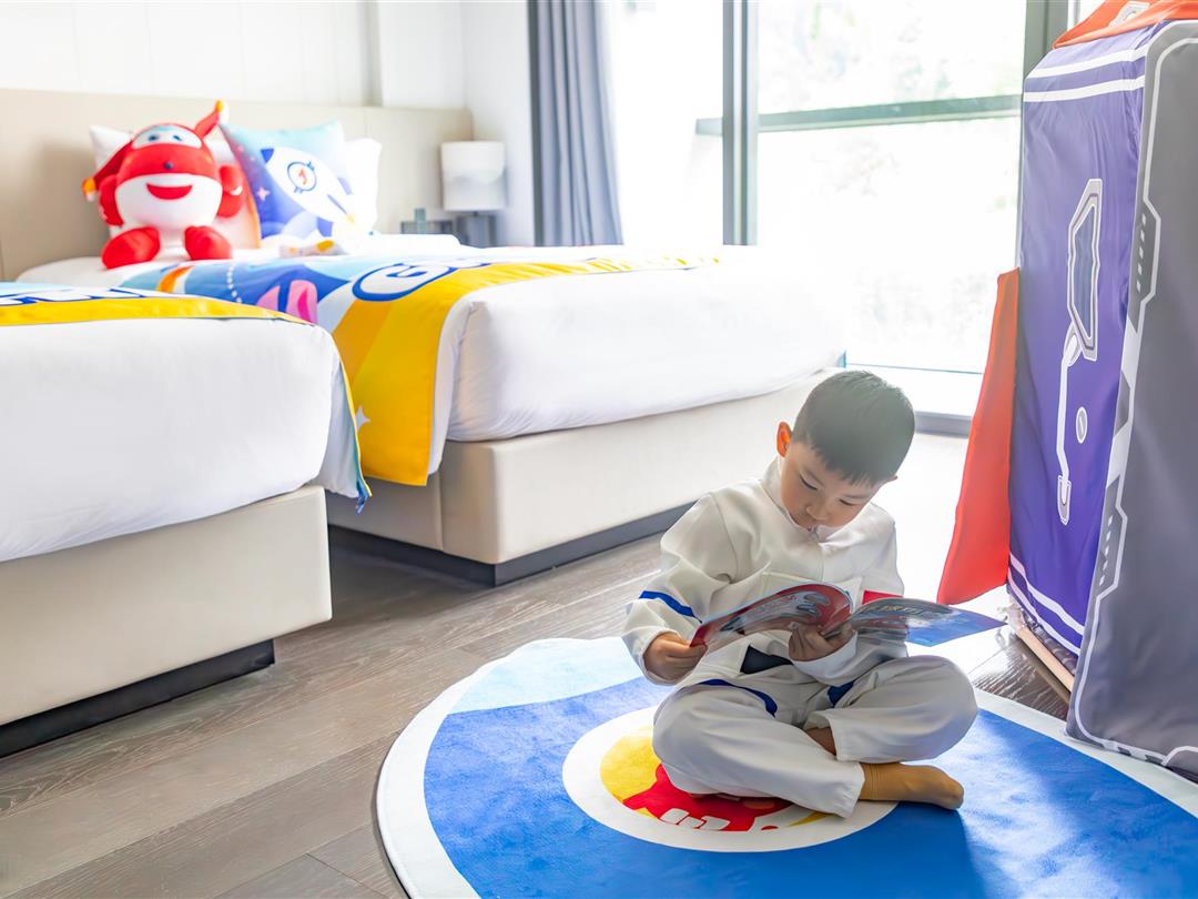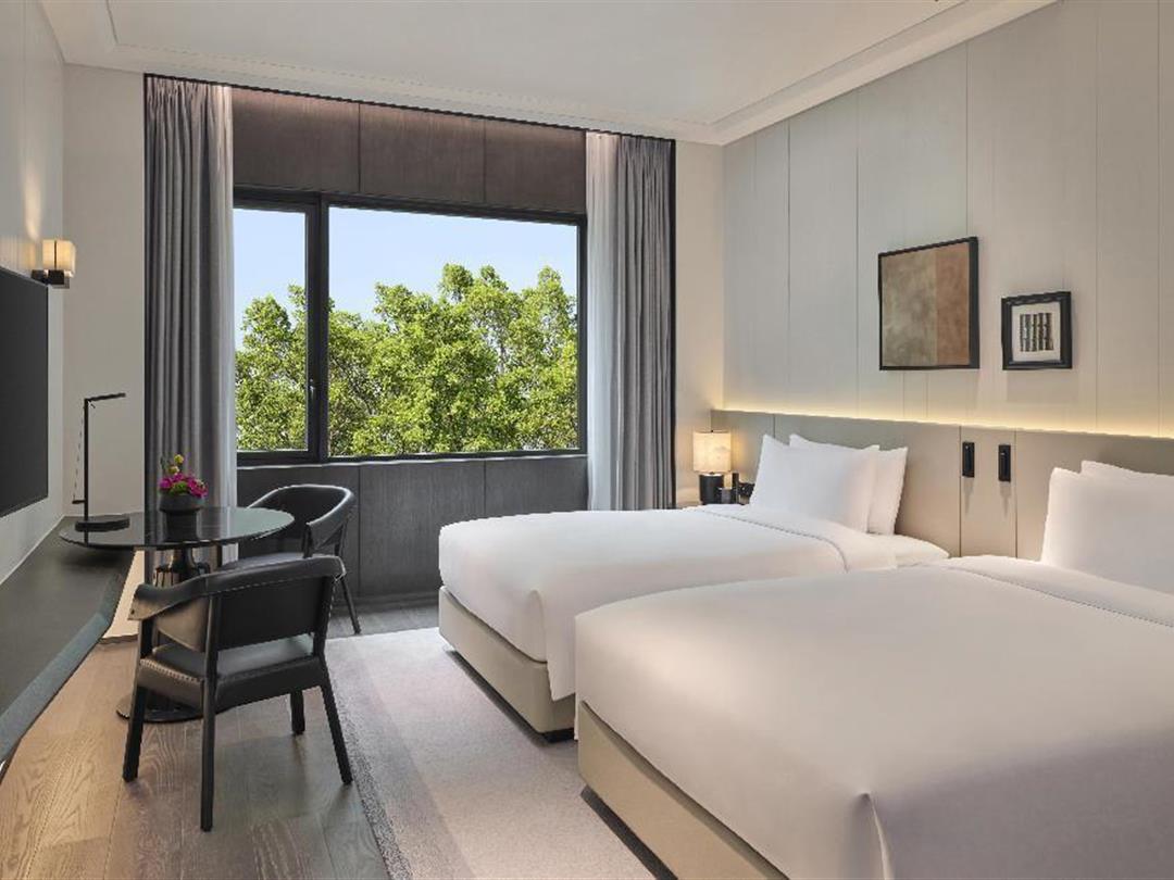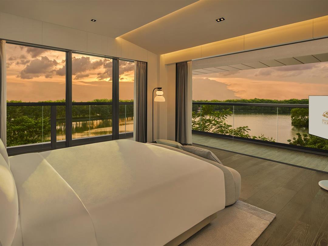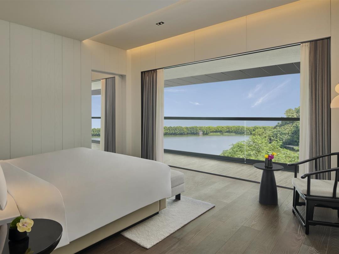 客房雅俗兼蓄,自然天成。空间设计运用黑白水墨相念,使得空间舍形而悦影,含质而趋灵,象征着包容、交流和融合,力求展现五岭之南历史与艺术脉络。源于岭南花窗演变的纹样打造的迷你吧柜门,打开即是功能齐全的迷你吧供客人使用