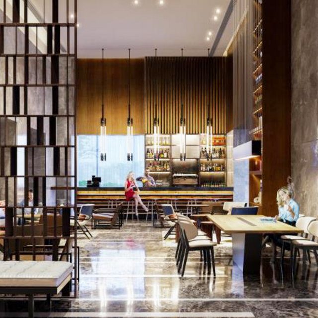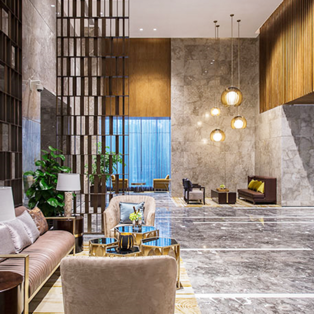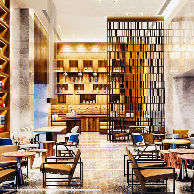 酒店延续福朋喜来登简约大气的设计风格,大堂运用大量深灰色大理石为基调、家具、装饰等都是以深色系为主,金属镂空隔断、暖色灯光、绿植...营造艺术氛围的同时,温馨舒适质感。