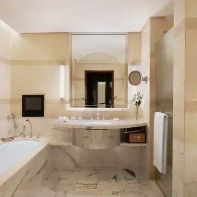 客房45㎡起,设计和装饰融合了东西方艺术风格,雅致沉稳。落地窗的设计,让室内采光通透且自然,豪华江景房,更能在节假日的晚上,观赏到绚烂灯光秀。干湿分离的浴室,配有浴缸,备品为法国品牌Essence d'Orient,带孩子入住,会提供儿童洗漱用品、拖鞋和浴袍。