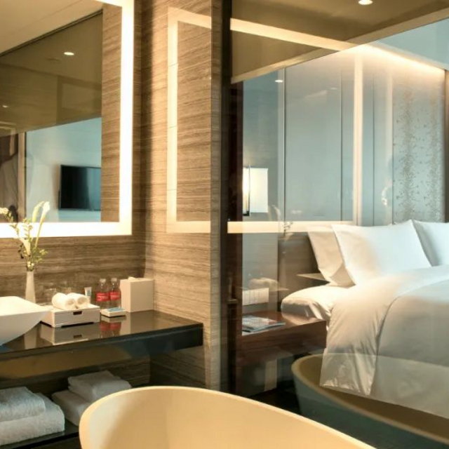 343间宽敞的客房和套房,俯瞰魔都的繁华的日与夜。主色调为大地色,点缀以沉稳的深色木材及现代家具,精致而典雅。